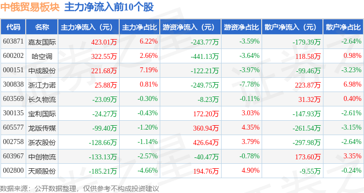 从资金流向上来看,当日中俄贸易板块主力资金净流出1.29亿元,游资资金净流入3965.51万元,散户资金净流入8965.61万元。中俄贸易板块个股资金流向见下表: