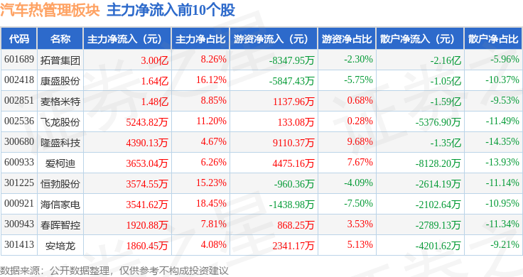 从资金流向上来看,当日汽车热管理板块主力资金净流出12.48亿元,游资资金净流入2.94亿元,散户资金净流入9.55亿元。汽车热管理板块个股资金流向见下表: