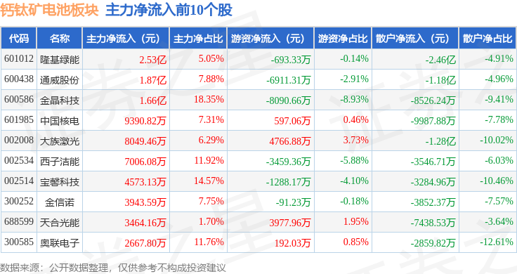 从资金流向上来看,当日钙钛矿电池板块主力资金净流入5.33亿元,游资资金净流入1.27亿元,散户资金净流出6.59亿元。钙钛矿电池板块个股资金流向见下表: