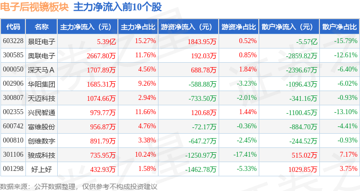 从资金流向上来看,当日电子后视镜板块主力资金净流出6.72亿元,游资资金净流入9.07亿元,散户资金净流出2.35亿元。电子后视镜板块个股资金流向见下表: