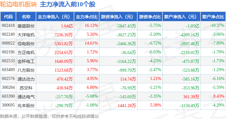 从资金流向上来看,当日轮边电机板块主力资金净流出3.2亿元,游资资金净流入5591.57万元,散户资金净流入2.64亿元。轮边电机板块个股资金流向见下表: