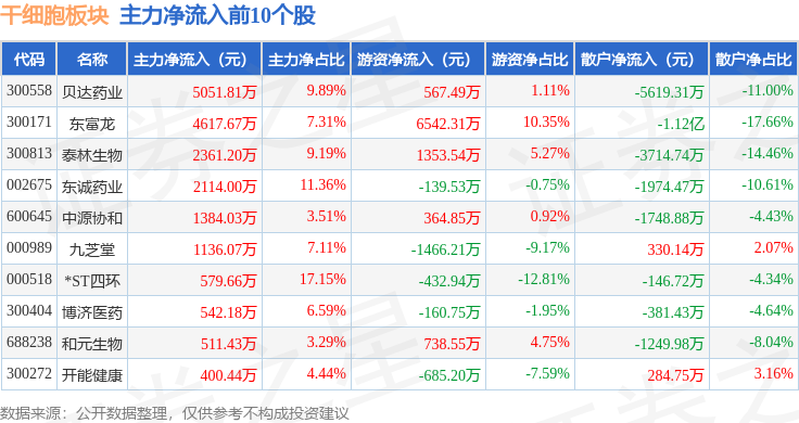 从资金流向上来看,当日干细胞板块主力资金净流出4273.65万元,游资资金净流入1.82亿元,散户资金净流出1.4亿元。干细胞板块个股资金流向见下表: