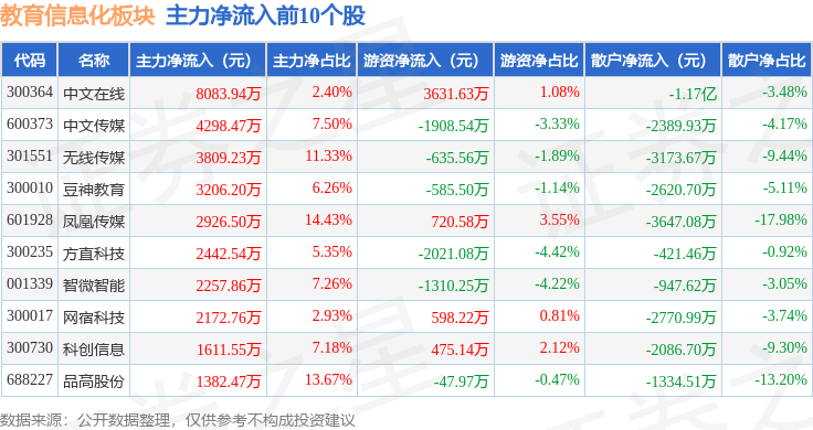 从资金流向上来看,当日教育信息化板块主力资金净流出5.6亿元,游资资金净流入3.36亿元,散户资金净流入2.24亿元。教育信息化板块个股资金流向见下表:
