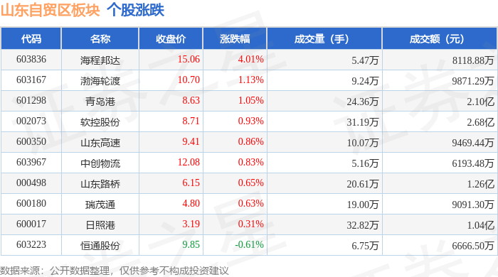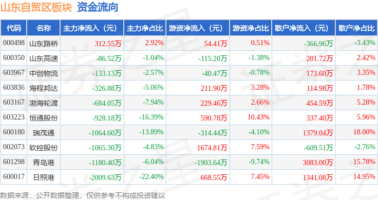 从资金流向上来看,当日山东自贸区板块主力资金净流出7166.14万元,游资资金净流入1056.17万元,散户资金净流入6108.93万元。山东自贸区板块个股资金流向见下表: