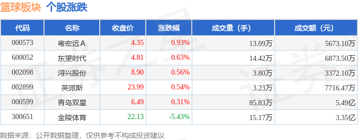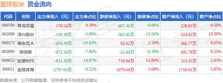 从资金流向上来看,当日篮球板块主力资金净流出4541.6万元,游资资金净流入1094.05万元,散户资金净流入3447.55万元。篮球板块个股资金流向见下表: