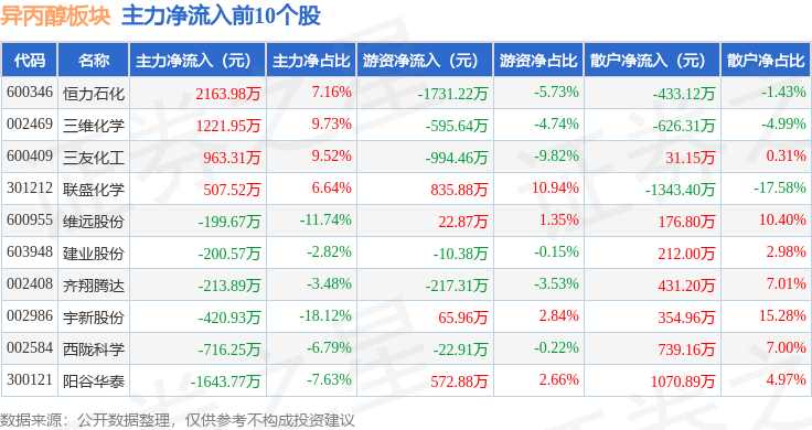 从资金流向上来看,当日异丙醇板块主力资金净流出2.31亿元,游资资金净流入5493.92万元,散户资金净流入1.77亿元。异丙醇板块个股资金流向见下表: