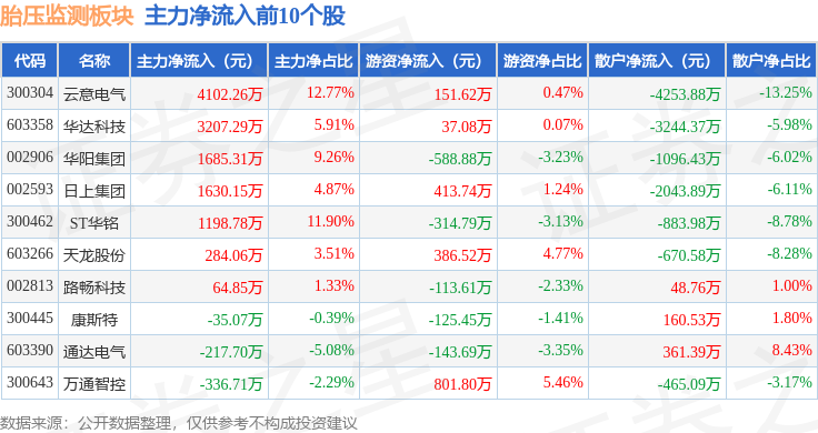 从资金流向上来看,当日胎压监测板块主力资金净流出1.23亿元,游资资金净流入1.08亿元,散户资金净流入1546.01万元。胎压监测板块个股资金流向见下表: