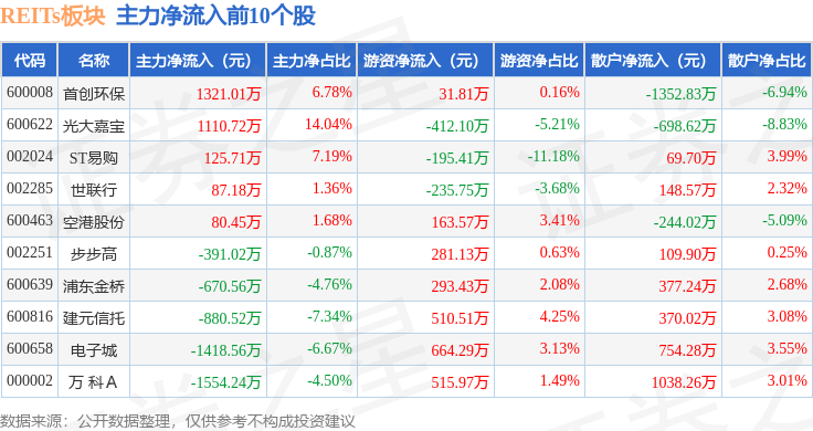从资金流向上来看,当日REITs板块主力资金净流出5.48亿元,游资资金净流入1.02亿元,散户资金净流入4.46亿元。REITs板块个股资金流向见下表: