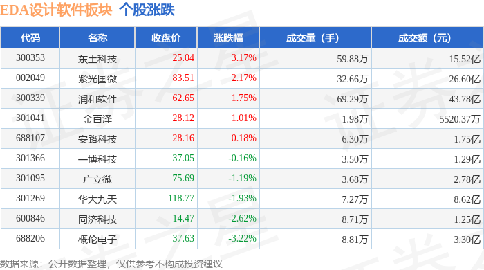 证券之星消息,11月3日EDA设计软件板块较上一交易日上涨0.23%,东土科技领涨。当日上证指数报收于3976.52,上涨0.55%。深证成指报收于13404.06,上涨0.19%。EDA设计软件板块个股涨跌见下表: