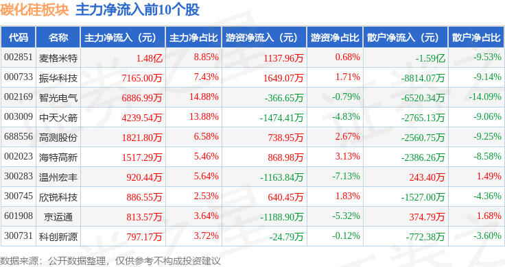 从资金流向上来看,当日碳化硅板块主力资金净流出15.3亿元,游资资金净流入3.46亿元,散户资金净流入11.83亿元。碳化硅板块个股资金流向见下表: