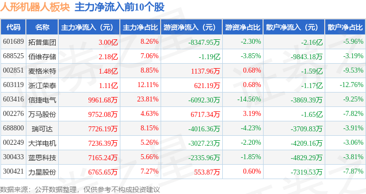 从资金流向上来看,当日人形机器人板块主力资金净流出36.21亿元,游资资金净流入9.63亿元,散户资金净流入26.59亿元。人形机器人板块个股资金流向见下表: