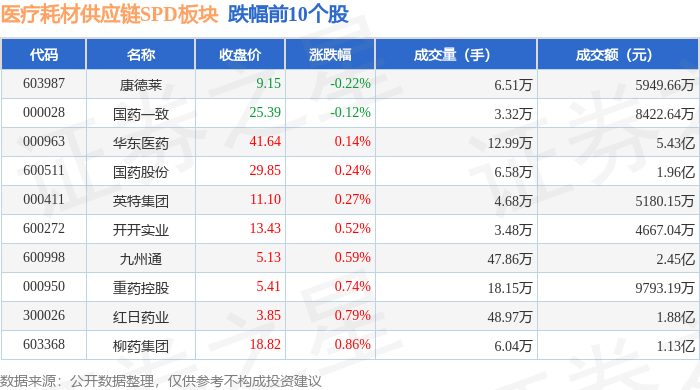 证券之星消息,11月3日医疗耗材供应链SPD板块较上一交易日上涨0.78%,合富中国领涨。当日上证指数报收于3976.52,上涨0.55%。深证成指报收于13404.06,上涨0.19%。医疗耗材供应链SPD板块个股涨跌见下表: