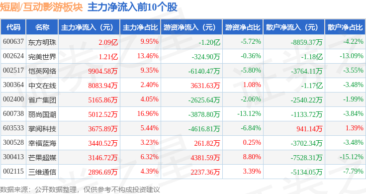 从资金流向上来看,当日短剧/互动影游板块主力资金净流入4.62亿元,游资资金净流出1.97亿元,散户资金净流出2.65亿元。短剧/互动影游板块个股资金流向见下表: