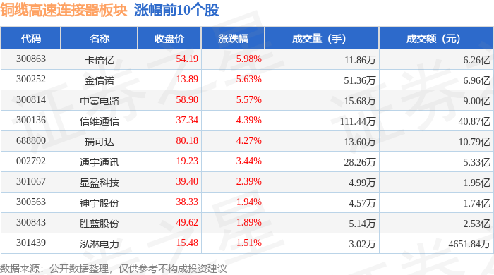 证券之星消息,11月3日铜缆高速连接器板块较上一交易日上涨0.28%,卡倍亿领涨。当日上证指数报收于3976.52,上涨0.55%。深证成指报收于13404.06,上涨0.19%。铜缆高速连接器板块个股涨跌见下表:
