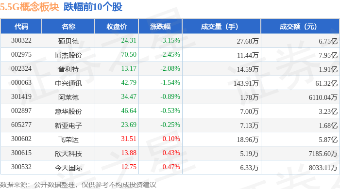 从资金流向上来看,当日5.5G概念板块主力资金净流出4.22亿元,游资资金净流入2.3亿元,散户资金净流入1.92亿元。5.5G概念板块个股资金流向见下表: