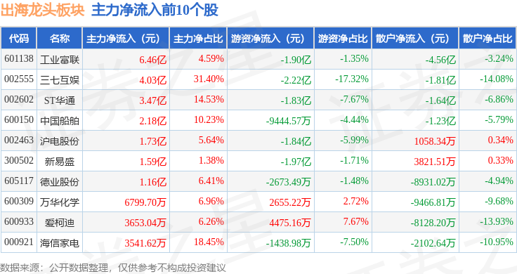 从资金流向上来看,当日出海龙头板块主力资金净流出32.32亿元,游资资金净流出1.26亿元,散户资金净流入33.58亿元。出海龙头板块个股资金流向见下表: