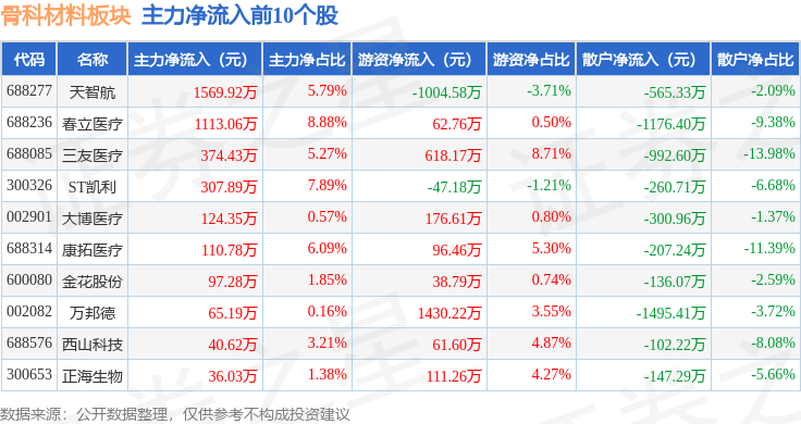 从资金流向上来看,当日骨科材料板块主力资金净流出1.14亿元,游资资金净流入3698.49万元,散户资金净流入7650.03万元。骨科材料板块个股资金流向见下表: