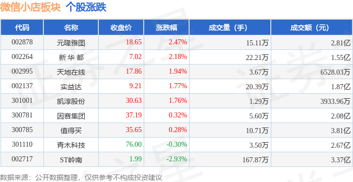 证券之星消息,11月3日微信小店板块较上一交易日上涨0.75%,元隆雅图领涨。当日上证指数报收于3976.52,上涨0.55%。深证成指报收于13404.06,上涨0.19%。微信小店板块个股涨跌见下表: