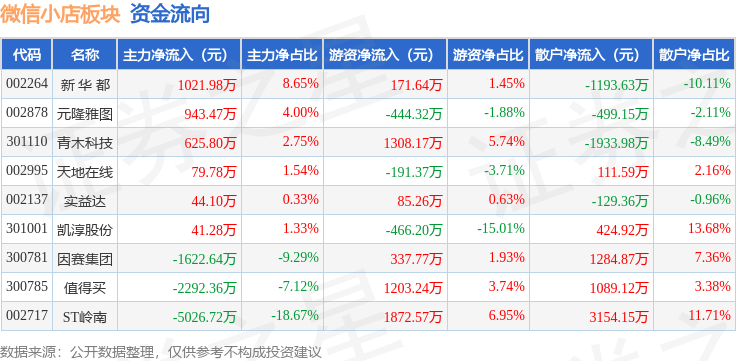 从资金流向上来看,当日微信小店板块主力资金净流出6185.3万元,游资资金净流入3876.78万元,散户资金净流入2308.53万元。微信小店板块个股资金流向见下表: