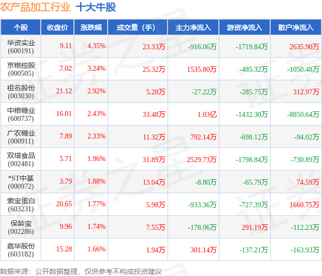 个股表现方面,农产品加工行业当日领涨股为华资实业(600191),该股当日报收9.11,上涨4.35%,成交量23.33万,主力资金净流出916.06万元。京粮控股(000505)以上涨3.24%紧随其后,该股当日成交量25.32万,主力资金净流入1535.8万元。除此之外,祖名股份(003030)、中粮糖业(600737)、广农糖业(000911)均进入当日牛股之列。具体个股列表见下表: