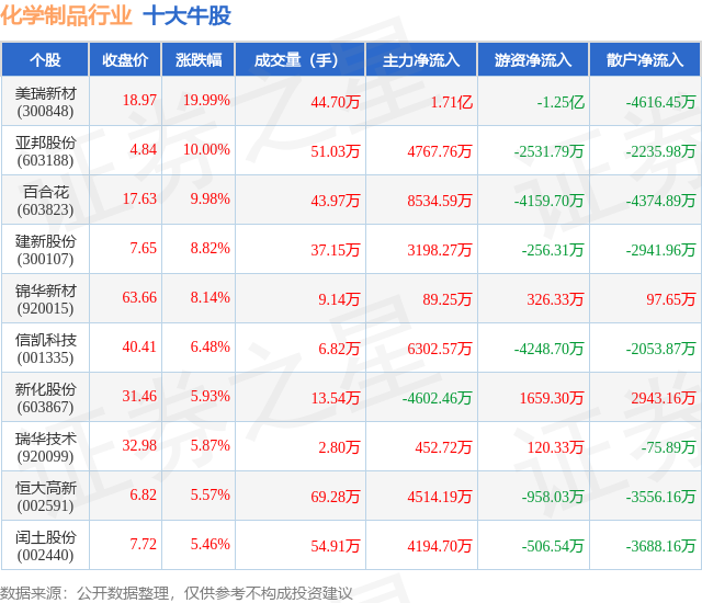个股表现方面,化学制品行业当日领涨股为美瑞新材(300848),该股当日报收18.97,上涨19.99%,成交量44.7万,主力资金净流入1.71亿元。亚邦股份(603188)以上涨10.0%紧随其后,该股当日成交量51.03万,主力资金净流入4767.76万元。除此之外,百合花(603823)、建新股份(300107)、锦华新材(920015)均进入当日牛股之列。具体个股列表见下表: