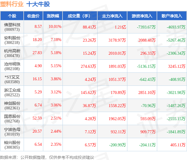 个股表现方面,塑料行业当日领涨股为佛塑科技(000973),该股当日报收8.57,上涨10.01%,成交量88.41万,主力资金净流入1.21亿元。安利股份(300218)以上涨7.18%紧随其后,该股当日成交量23.26万,主力资金净流入3178.97万元。除此之外,杭州高新(300478)、沧州明珠(002108)、*ST艾艾(603580)均进入当日牛股之列。具体个股列表见下表:
