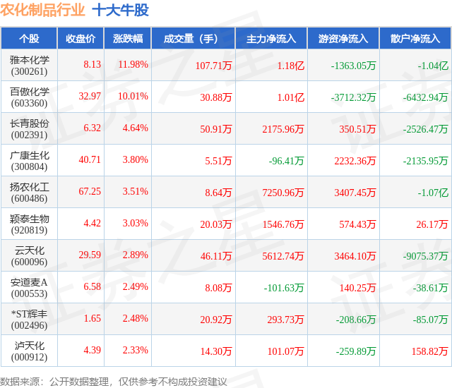 个股表现方面,农化制品行业当日领涨股为雅本化学(300261),该股当日报收8.13,上涨11.98%,成交量107.71万,主力资金净流入1.18亿元。百傲化学(603360)以上涨10.01%紧随其后,该股当日成交量30.88万,主力资金净流入1.01亿元。除此之外,长青股份(002391)、广康生化(300804)、扬农化工(600486)均进入当日牛股之列。具体个股列表见下表: