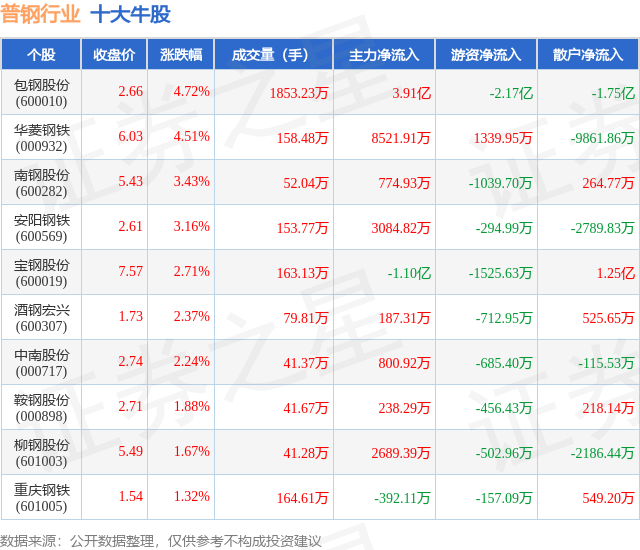 个股表现方面,普钢行业当日领涨股为包钢股份(600010),该股当日报收2.66,上涨4.72%,成交量1853.23万,主力资金净流入3.91亿元。华菱钢铁(000932)以上涨4.51%紧随其后,该股当日成交量158.48万,主力资金净流入8521.91万元。除此之外,南钢股份(600282)、安阳钢铁(600569)、宝钢股份(600019)均进入当日牛股之列。具体个股列表见下表: