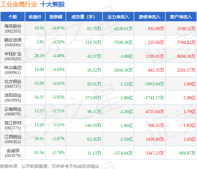 个股表现方面,工业金属行业当日领跌股为海亮股份(002203),该股当日报收10.95,下跌4.87%,成交量65.7万,主力资金净流出4530.61万元。鹏欣资源(600490)以下跌4.52%紧随其后,该股当日成交量114.39万,主力资金净流出7930.38万元。除此之外,华钰矿业(601020)、株冶集团(600961)、北方铜业(000737)均进入当日熊股之列。具体个股列表见下表: