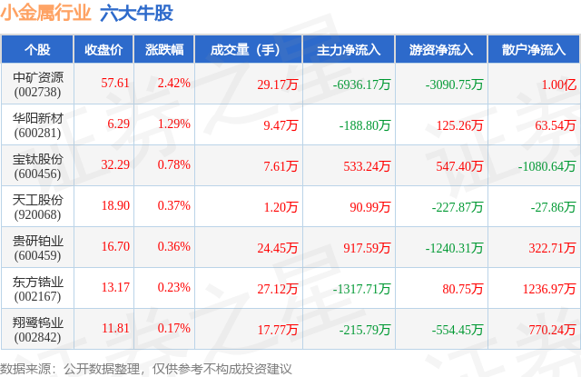 个股表现方面,小金属行业当日领涨股为中矿资源(002738),该股当日报收57.61,上涨2.42%,成交量29.17万,主力资金净流出6936.17万元。华阳新材(600281)以上涨1.29%紧随其后,该股当日成交量9.47万,主力资金净流出188.8万元。除此之外,宝钛股份(600456)、天工股份(920068)、贵研铂业(600459)均进入当日牛股之列。具体个股列表见下表: