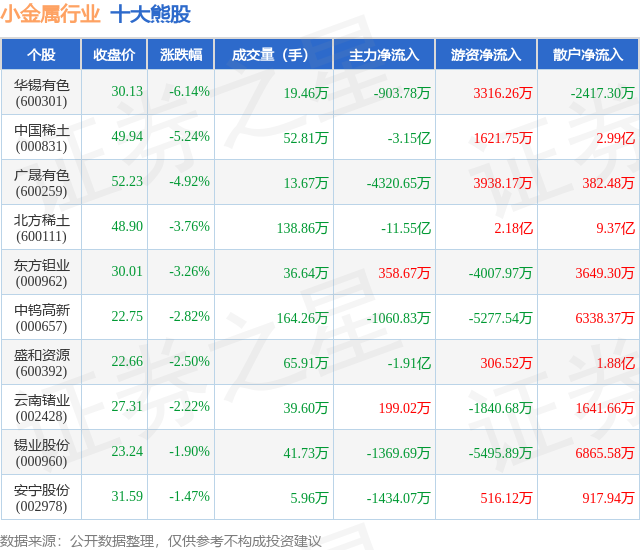 个股表现方面,小金属行业当日领跌股为华锡有色(600301),该股当日报收30.13,下跌6.14%,成交量19.46万,主力资金净流出903.78万元。中国稀土(000831)以下跌5.24%紧随其后,该股当日成交量52.81万,主力资金净流出3.15亿元。除此之外,广晟有色(600259)、北方稀土(600111)、东方钽业(000962)均进入当日熊股之列。具体个股列表见下表: