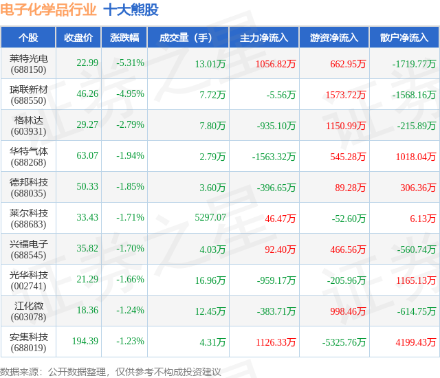 个股表现方面,电子化学品行业当日领跌股为莱特光电(688150),该股当日报收22.99,下跌5.31%,成交量13.01万,主力资金净流入1056.82万元。瑞联新材(688550)以下跌4.95%紧随其后,该股当日成交量7.72万,主力资金净流出5.56万元。除此之外,格林达(603931)、华特气体(688268)、德邦科技(688035)均进入当日熊股之列。具体个股列表见下表: