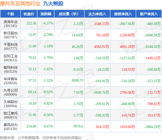 个股表现方面,摩托车及其他行业当日领跌股为涛涛车业(301345),该股当日报收222.36,下跌6.37%,成交量2.23万,主力资金净流入2548.23万元。新日股份(603787)以下跌2.78%紧随其后,该股当日成交量14.09万,主力资金净流入701.58万元。除此之外,千里科技(601777)、征和工业(003033)、爱玛科技(603529)均进入当日熊股之列。具体个股列表见下表: