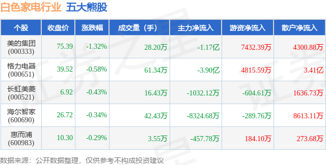 个股表现方面,白色家电行业当日领跌股为美的集团(000333),该股当日报收75.39,下跌1.32%,成交量28.2万,主力资金净流出1.17亿元。格力电器(000651)以下跌0.58%紧随其后,该股当日成交量61.34万,主力资金净流出3.9亿元。除此之外,长虹美菱(000521)、海尔智家(600690)、惠而浦(600983)均进入当日熊股之列。具体个股列表见下表: