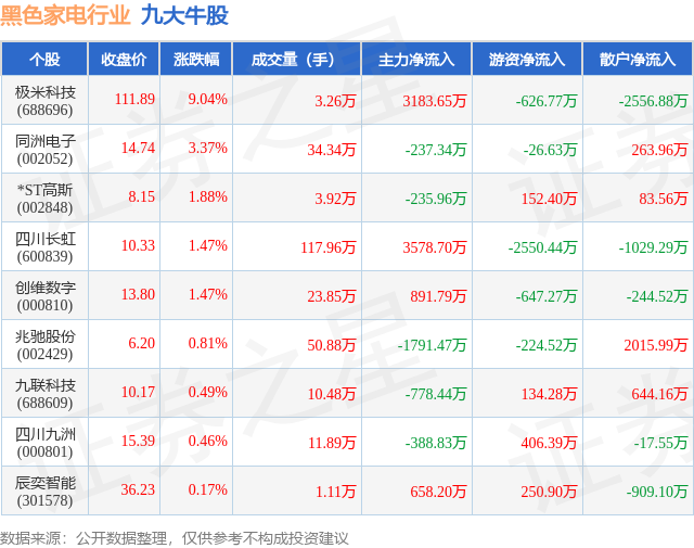 个股表现方面,黑色家电行业当日领涨股为极米科技(688696),该股当日报收111.89,上涨9.04%,成交量3.26万,主力资金净流入3183.65万元。同洲电子(002052)以上涨3.37%紧随其后,该股当日成交量34.34万,主力资金净流出237.34万元。除此之外,*ST高斯(002848)、四川长虹(600839)、创维数字(000810)均进入当日牛股之列。具体个股列表见下表: