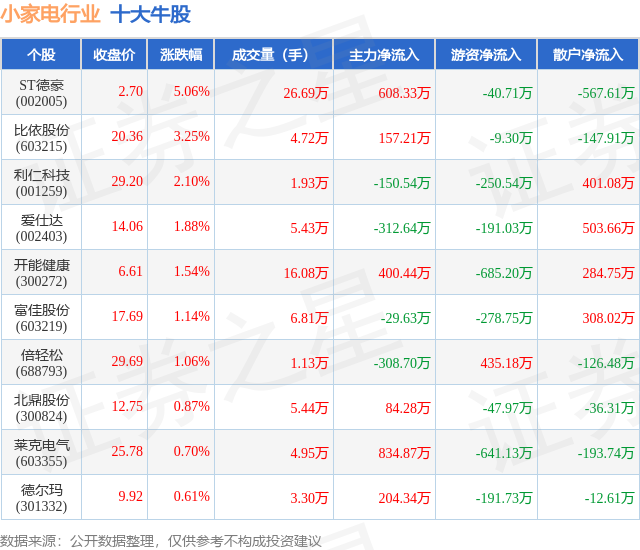 个股表现方面,小家电行业当日领涨股为ST德豪(002005),该股当日报收2.7,上涨5.06%,成交量26.69万,主力资金净流入608.33万元。比依股份(603215)以上涨3.25%紧随其后,该股当日成交量4.72万,主力资金净流入157.21万元。除此之外,利仁科技(001259)、爱仕达(002403)、开能健康(300272)均进入当日牛股之列。具体个股列表见下表: