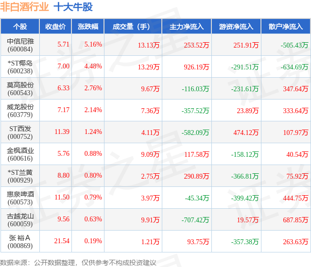 个股表现方面,非白酒行业当日领涨股为中信尼雅(600084),该股当日报收5.71,上涨5.16%,成交量13.13万,主力资金净流入253.52万元。*ST椰岛(600238)以上涨4.48%紧随其后,该股当日成交量13.29万,主力资金净流入926.19万元。除此之外,莫高股份(600543)、威龙股份(603779)、ST西发(000752)均进入当日牛股之列。具体个股列表见下表: