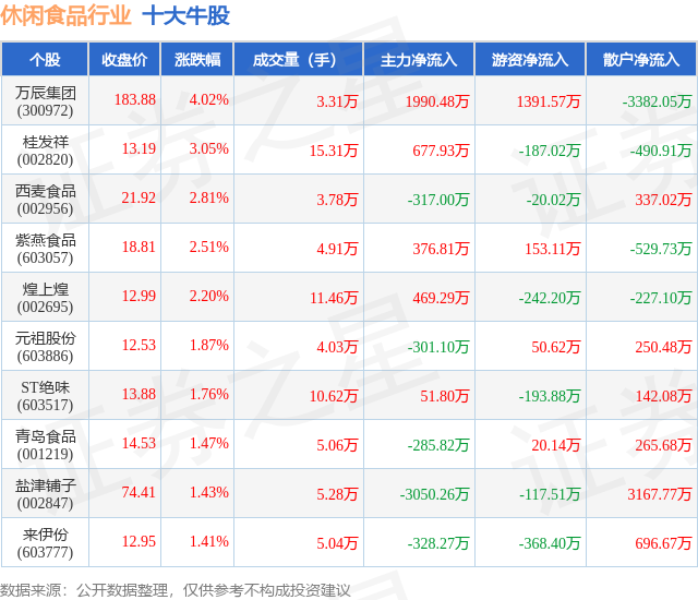 个股表现方面,休闲食品行业当日领涨股为万辰集团(300972),该股当日报收183.88,上涨4.02%,成交量3.31万,主力资金净流入1990.48万元。桂发祥(002820)以上涨3.05%紧随其后,该股当日成交量15.31万,主力资金净流入677.93万元。除此之外,西麦食品(002956)、紫燕食品(603057)、煌上煌(002695)均进入当日牛股之列。具体个股列表见下表: