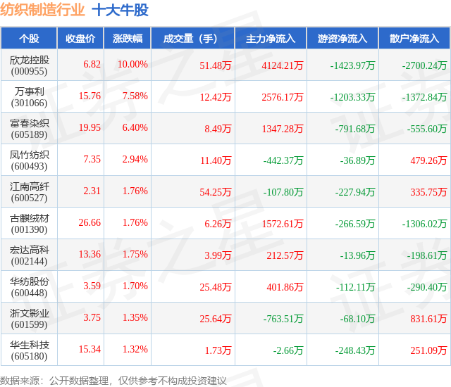 个股表现方面,纺织制造行业当日领涨股为欣龙控股(000955),该股当日报收6.82,上涨10.0%,成交量51.48万,主力资金净流入4124.21万元。万事利(301066)以上涨7.58%紧随其后,该股当日成交量12.42万,主力资金净流入2576.17万元。除此之外,富春染织(605189)、凤竹纺织(600493)、江南高纤(600527)均进入当日牛股之列。具体个股列表见下表: