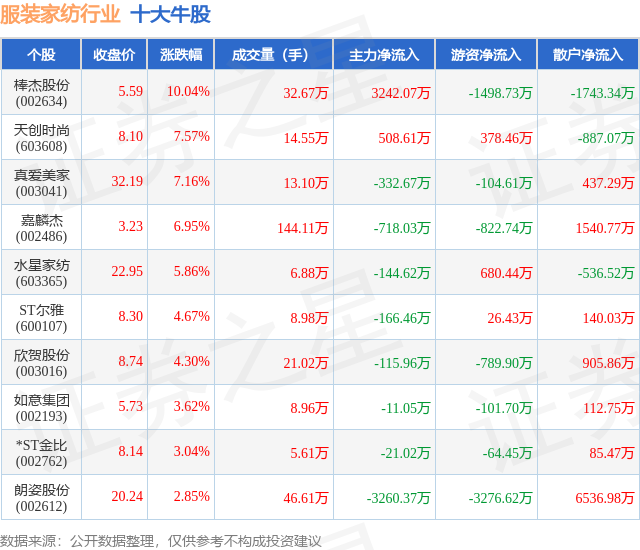 个股表现方面,服装家纺行业当日领涨股为棒杰股份(002634),该股当日报收5.59,上涨10.04%,成交量32.67万,主力资金净流入3242.07万元。天创时尚(603608)以上涨7.57%紧随其后,该股当日成交量14.55万,主力资金净流入508.61万元。除此之外,真爱美家(003041)、嘉麟杰(002486)、水星家纺(603365)均进入当日牛股之列。具体个股列表见下表: