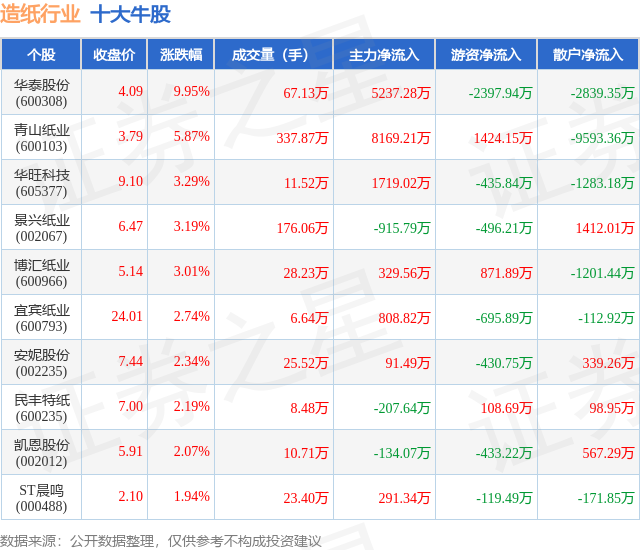 个股表现方面,造纸行业当日领涨股为华泰股份(600308),该股当日报收4.09,上涨9.95%,成交量67.13万,主力资金净流入5237.28万元。青山纸业(600103)以上涨5.87%紧随其后,该股当日成交量337.87万,主力资金净流入8169.21万元。除此之外,华旺科技(605377)、景兴纸业(002067)、博汇纸业(600966)均进入当日牛股之列。具体个股列表见下表: