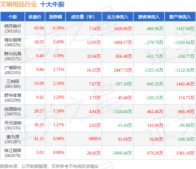个股表现方面,文娱用品行业当日领涨股为明月镜片(301101),该股当日报收43.94,上涨6.39%,成交量7.54万,主力资金净流入1628.06万元。海伦钢琴(300329)以上涨5.43%紧随其后,该股当日成交量12.05万,主力资金净流入1604.57万元。除此之外,群兴玩具(002575)、广博股份(002103)、三柏硕(001300)均进入当日牛股之列。具体个股列表见下表: