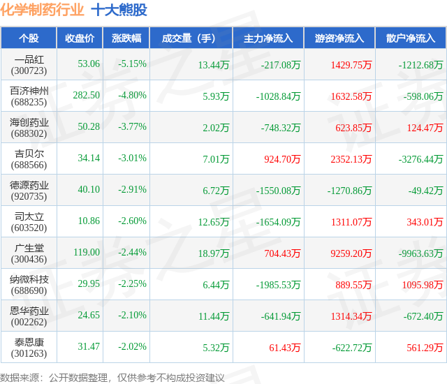 个股表现方面,化学制药行业当日领跌股为一品红(300723),该股当日报收53.06,下跌5.15%,成交量13.44万,主力资金净流出217.08万元。百济神州(688235)以下跌4.8%紧随其后,该股当日成交量5.93万,主力资金净流出1028.84万元。除此之外,海创药业(688302)、吉贝尔(688566)、德源药业(920735)均进入当日熊股之列。具体个股列表见下表: