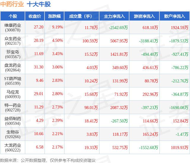 个股表现方面,中药行业当日领涨股为维康药业(300878),该股当日报收27.2,上涨9.19%,成交量11.78万,主力资金净流出2542.69万元。众生药业(002317)以上涨4.5%紧随其后,该股当日成交量100.59万,主力资金净流入5067.95万元。除此之外,珍宝岛(603567)、盘龙药业(002864)、ST葫芦娃(605199)均进入当日牛股之列。具体个股列表见下表: