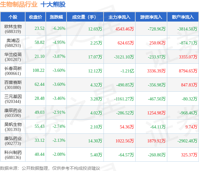 个股表现方面,生物制品行业当日领跌股为欧林生物(688319),该股当日报收23.52,下跌6.26%,成交量12.69万,主力资金净流入4543.46万元。奥浦迈(688293)以下跌4.95%紧随其后,该股当日成交量2.25万,主力资金净流入624.65万元。除此之外,华兰疫苗(301207)、长春高新(000661)、百普赛斯(301080)均进入当日熊股之列。具体个股列表见下表:
