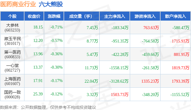 个股表现方面,医药商业行业当日领跌股为大参林(603233),该股当日报收18.15,下跌0.71%,成交量7.45万,主力资金净流出183.34万元。漱玉平民(301017)以下跌0.57%紧随其后,该股当日成交量8.77万,主力资金净流出951.35万元。除此之外,第一医药(600833)、一心堂(002727)、上海医药(601607)均进入当日熊股之列。具体个股列表见下表: