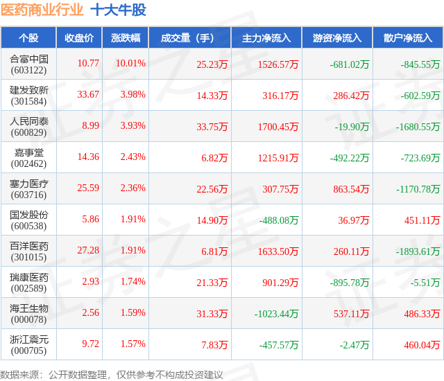 个股表现方面,医药商业行业当日领涨股为合富中国(603122),该股当日报收10.77,上涨10.01%,成交量25.23万,主力资金净流入1526.57万元。建发致新(301584)以上涨3.98%紧随其后,该股当日成交量14.33万,主力资金净流入316.17万元。除此之外,人民同泰(600829)、嘉事堂(002462)、塞力医疗(603716)均进入当日牛股之列。具体个股列表见下表: