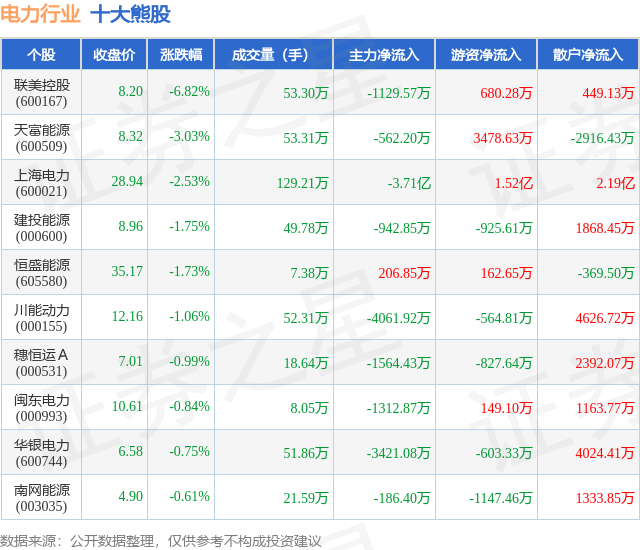 个股表现方面,电力行业当日领跌股为联美控股(600167),该股当日报收8.2,下跌6.82%,成交量53.3万,主力资金净流出1129.57万元。天富能源(600509)以下跌3.03%紧随其后,该股当日成交量53.31万,主力资金净流出562.2万元。除此之外,上海电力(600021)、建投能源(000600)、恒盛能源(605580)均进入当日熊股之列。具体个股列表见下表: