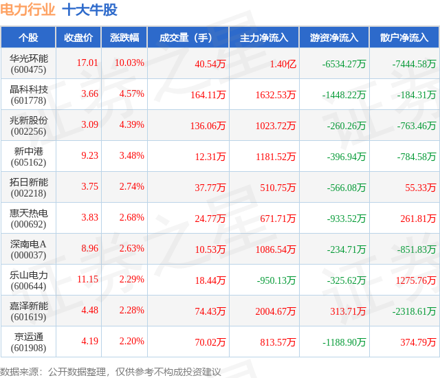 个股表现方面,电力行业当日领涨股为华光环能(600475),该股当日报收17.01,上涨10.03%,成交量40.54万,主力资金净流入1.4亿元。晶科科技(601778)以上涨4.57%紧随其后,该股当日成交量164.11万,主力资金净流入1632.53万元。除此之外,兆新股份(002256)、新中港(605162)、拓日新能(002218)均进入当日牛股之列。具体个股列表见下表: