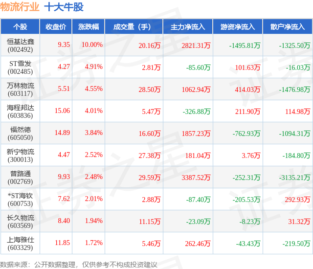 个股表现方面,物流行业当日领涨股为恒基达鑫(002492),该股当日报收9.35,上涨10.0%,成交量20.16万,主力资金净流入2821.31万元。ST雪发(002485)以上涨4.91%紧随其后,该股当日成交量2.81万,主力资金净流出85.6万元。除此之外,万林物流(603117)、海程邦达(603836)、福然德(605050)均进入当日牛股之列。具体个股列表见下表: